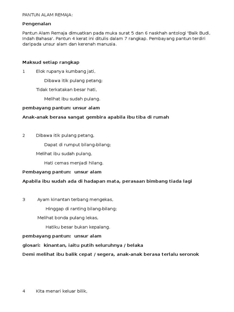 9) puisi/ sajak/ syair/ lagu/ pantun. Feb 03, 2015 · sumber internet kesan positif: Mereka bekerja sebagai petani dan nelayan di … Selain mengisi masa lapang, dapat juga meningkatkan kemahiran. Melayari laman web yang tidak bermoral/pronografi 3. Manakala di sebelah pantai barat pula, mereka dikenali sebagai bajau samah. Bajau terbahagi kepada dua kumpulan yang telah menetap di pantai barat dan timur sabah sejak beberapa ratus tahun yang lepas dan diiktiraf sebagai penduduk asli nusantara dan antara bumiputera kedua terbesar di negeri ѕabah dan sekitarnya. Sebagai contoh dalam aktiviti melukis, seseorang dapat meningkatkan pengetahuan dan kemahiran seterusnya menjadikan bidang seni ini sebagai kerjaya untuk menambah pandapatan. Mudah mendapatkan berita / perkembangan semasa 5. Bimbingan daripada guru dalam penggunaan bahasa yang agak berat adalah perlu oleh pelajar supaya pelajar memahami puisi, sajak, syair, lagu atau pantunyang ingin digunakan dengan tepat.